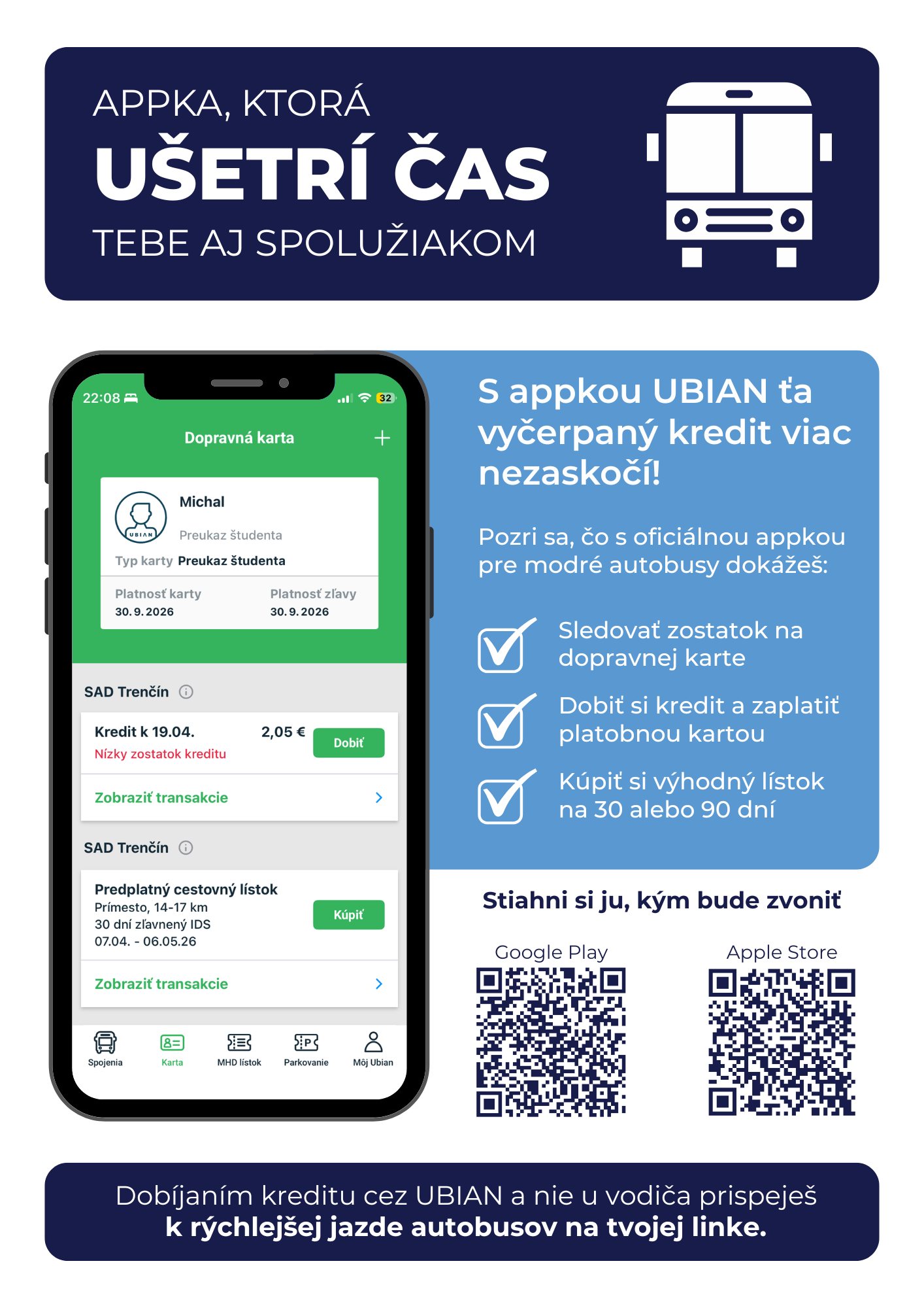 S Ubianom máte po ruke aktuálne cestovné poriadky, správu dopravnej karty (na svoju dopravnú kartu si môžete Dobiť kredit či Kúpiť časový lístok) alebo si jednoducho kúpite lístky na MHD alebo na vlak. V Ubiane vidíte aktuálny zostatok kreditu na dopravnej karte, transakcie vykonané dopravnou kartou ako aj platnosť časového lístka, cestovného lístka, či električenky. Môžete si kúpiť novú virtuálnu dopravnú kartu, ktorú si uložíte do Peňaženky Google a cestovné platíte mobilom.